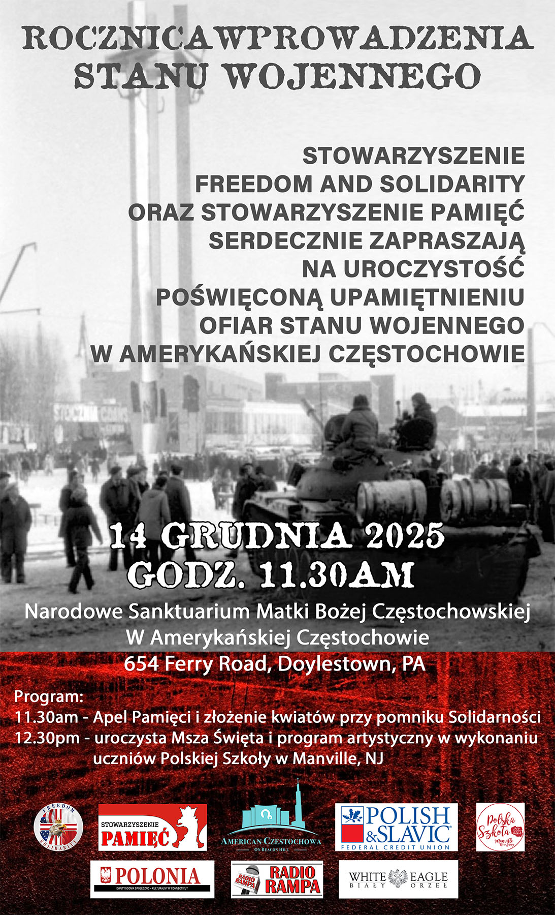 Stowarzyszenie Freedom and Solidarity oraz Stowarzyszenie Pamięć zapraszają na uroczystości upamiętniające ofiary stanu wojennego wprowadzonego w Polsce 13 grudnia 1981 roku.